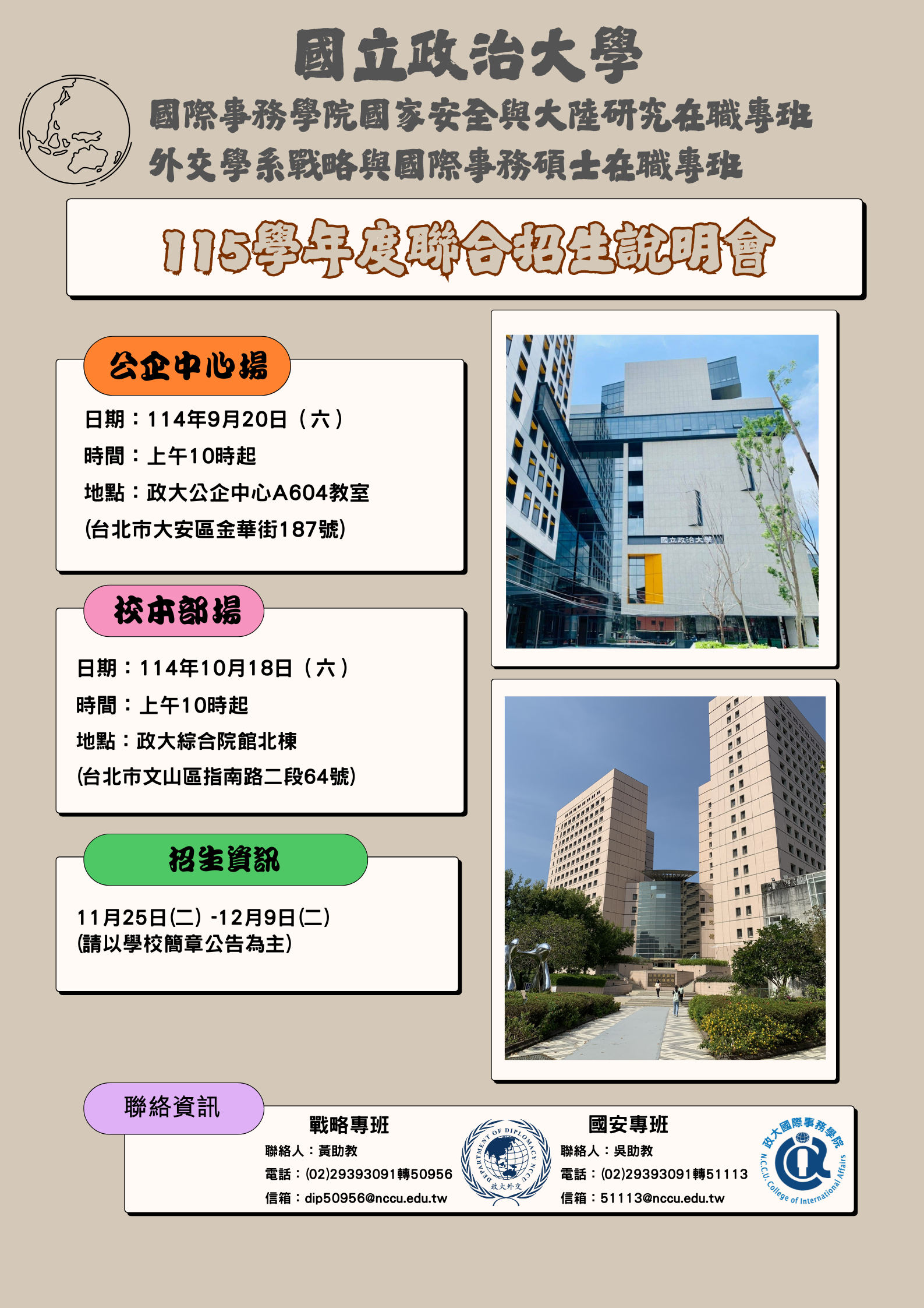 國立政治大學國際事務學院「國家安全與大陸研究碩士在職專班」以及「外交學系戰略與國際事務碩士在職專班」115學年度聯合招生說明會資訊Post author:管理員Post published:2025-09-19Post category:03一般公告 / 教務處Post last modified:2025-09-19國立政治大學函宣傳海報 Post Views: 50