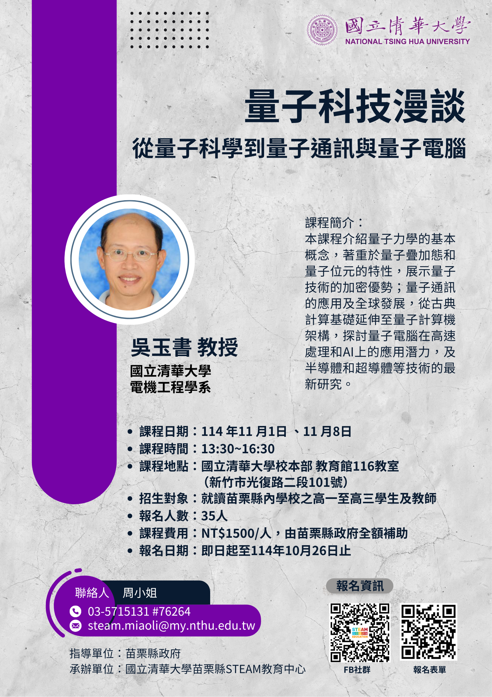 國立清華大學「量子科技漫談:從量子科學到量子通訊與量子電腦」主題課程Post author:管理員Post published:2025-10-28Post category:03一般公告 / 教務處Post last modified:2025-10-28海報 Post Views: 18