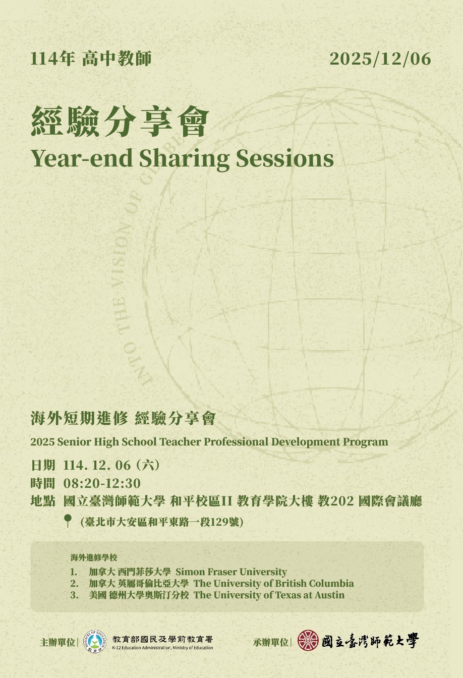 教育部國民及學前教育署檢送「114年選送高級中等學校教師海外短期進修」經驗分享會資訊1份