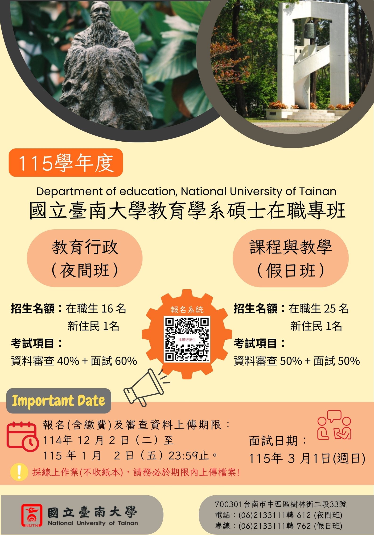 國立臺南大學教育學系115學年度碩士班及碩士在職專班入學考試報名資訊